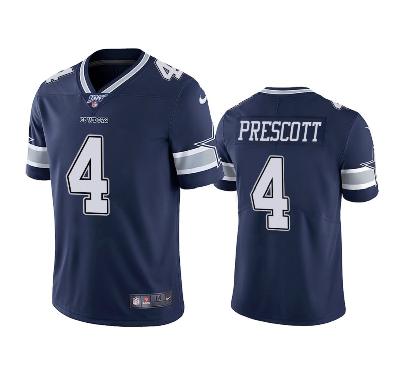 Get ready to celebrate 100th anniversary and keep your spirits high as you cheer on your team in this Men Dallas Cowboys #4 Dak Prescott 100th Season Navy Vapor Limited Jersey. The authentic look of this Nike jersey will be able to show off your fandom.