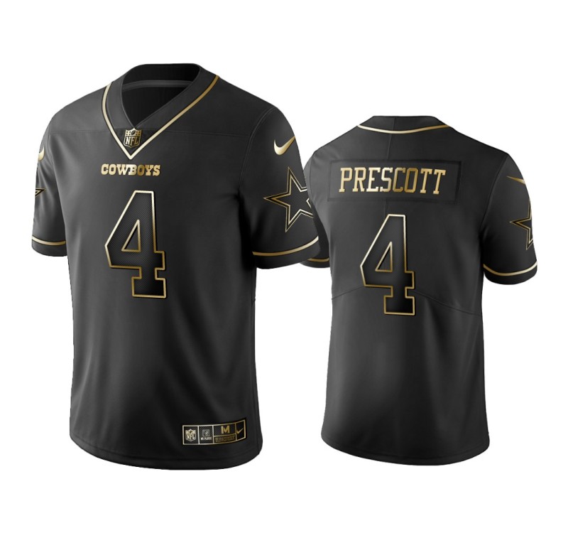 Every fan has various pieces of fan apparel that are a little different from the standard clothing that makes up most of their wardrobe or collection, and this Men Dallas Cowboys #4 Golden Edition Vapor Untouchable Limited Dak Prescott Black Jersey will definitely stand out from the others. The Gold Vapor Untouchable Limited jersey design includes a golden team graphics screen-printed on the front and on both sleeves, the golden player's name and number on the the front and back.